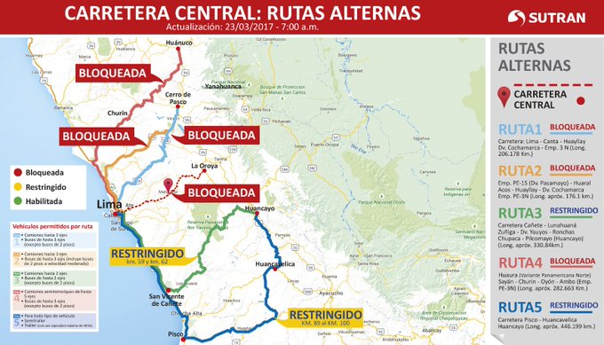 Finalmente resaltó que, a parte de la provicional vía del tren, no existe ninguna ruta alterna para viajar por tierra de Lima a la sierra central y viceversa. Detalló que los cinco desvíos se encuentran bloqueados por los deslizamientos.