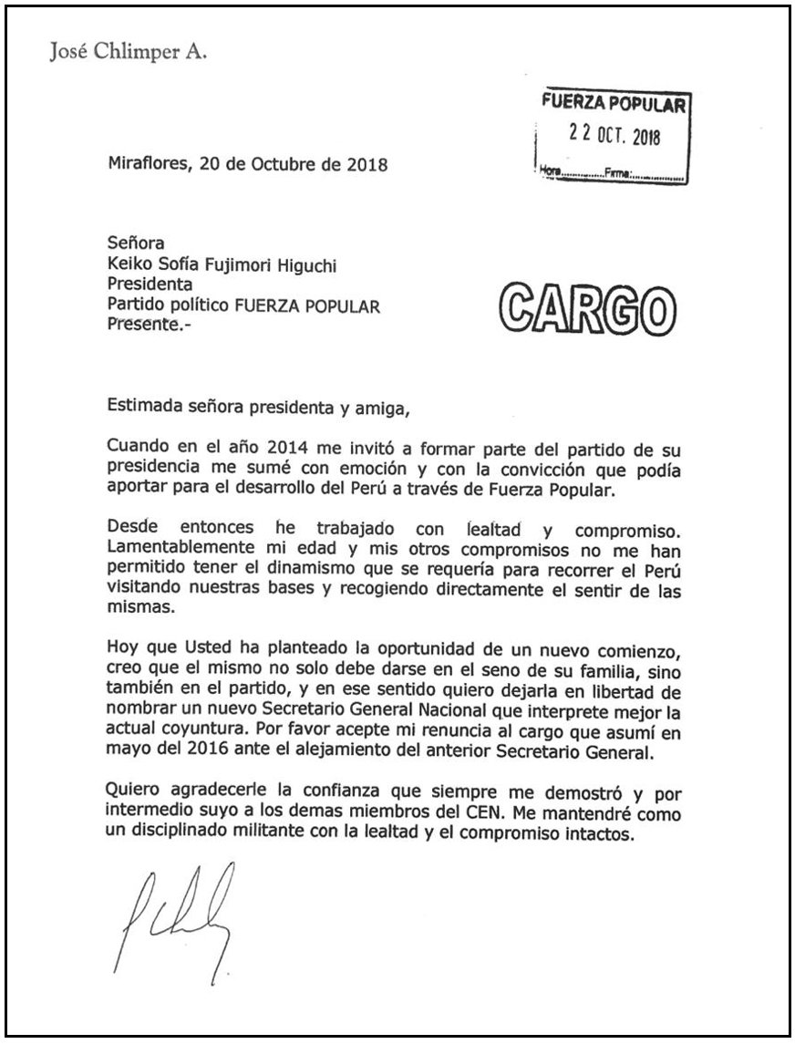 KEIKO FUJIMORI ACEPTA LA RENUNCIA DE CHLIMPER